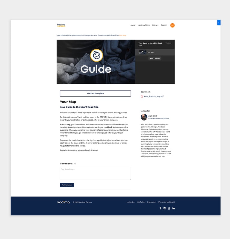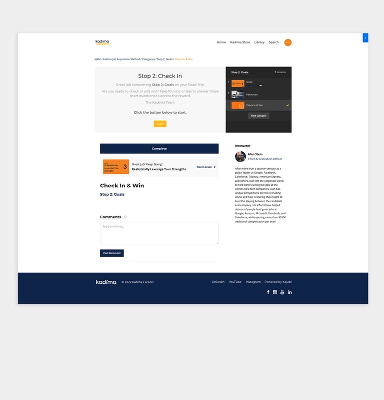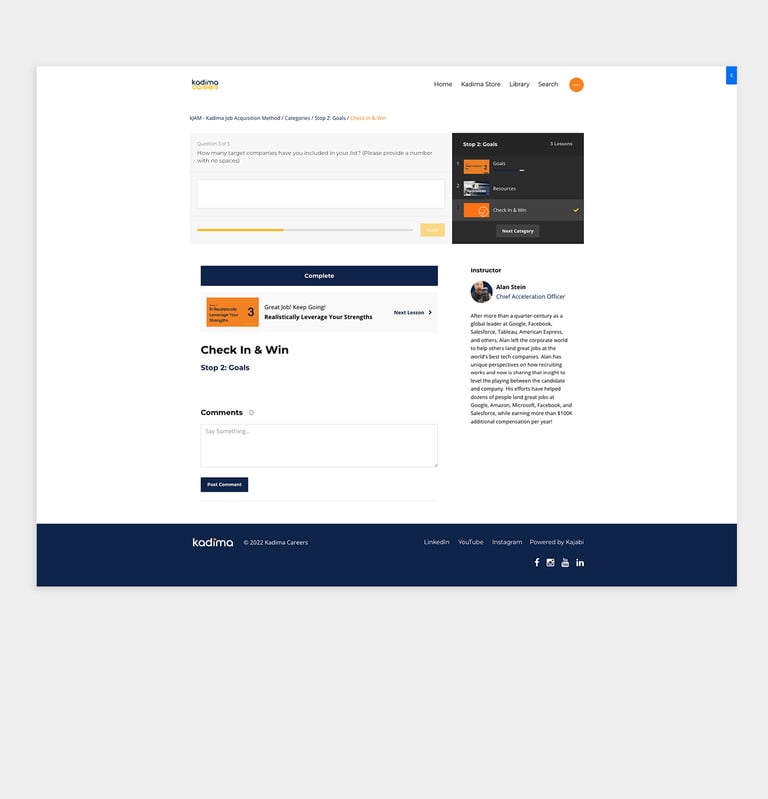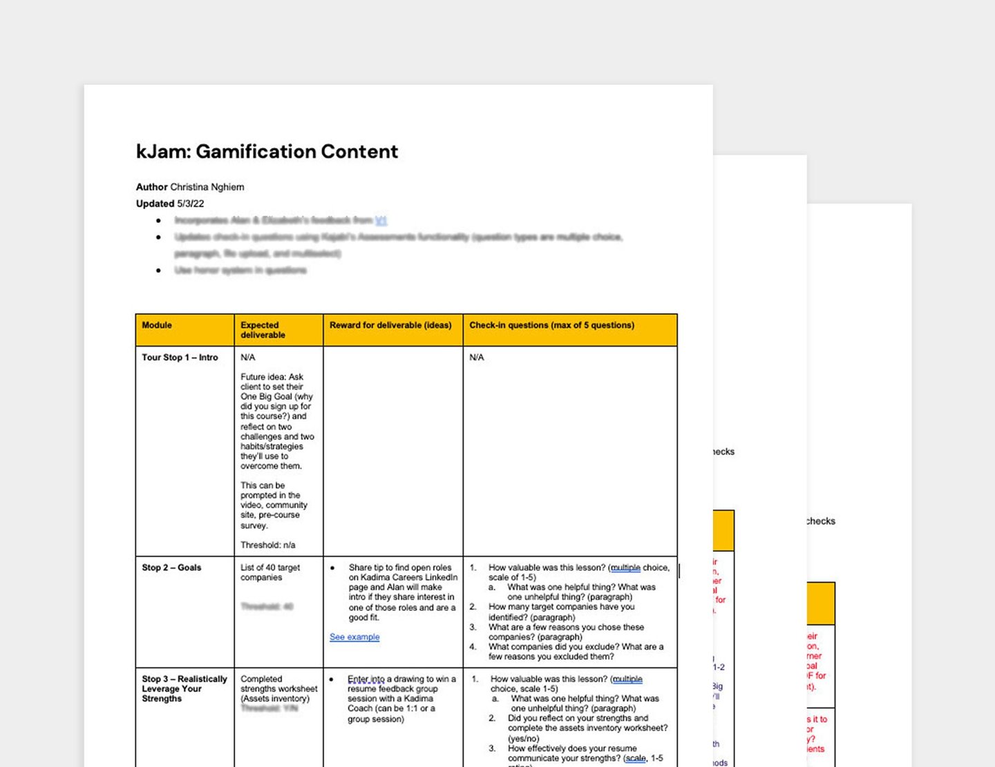 Alan, the CEO, and the team was finalizing the content for their kJAM (Kadima's Job Acquisition Method) course when we met. They were looking for ways to gamify the learning experience and gather data from learners throughout the course to ensure they got the support needed.