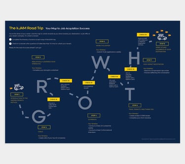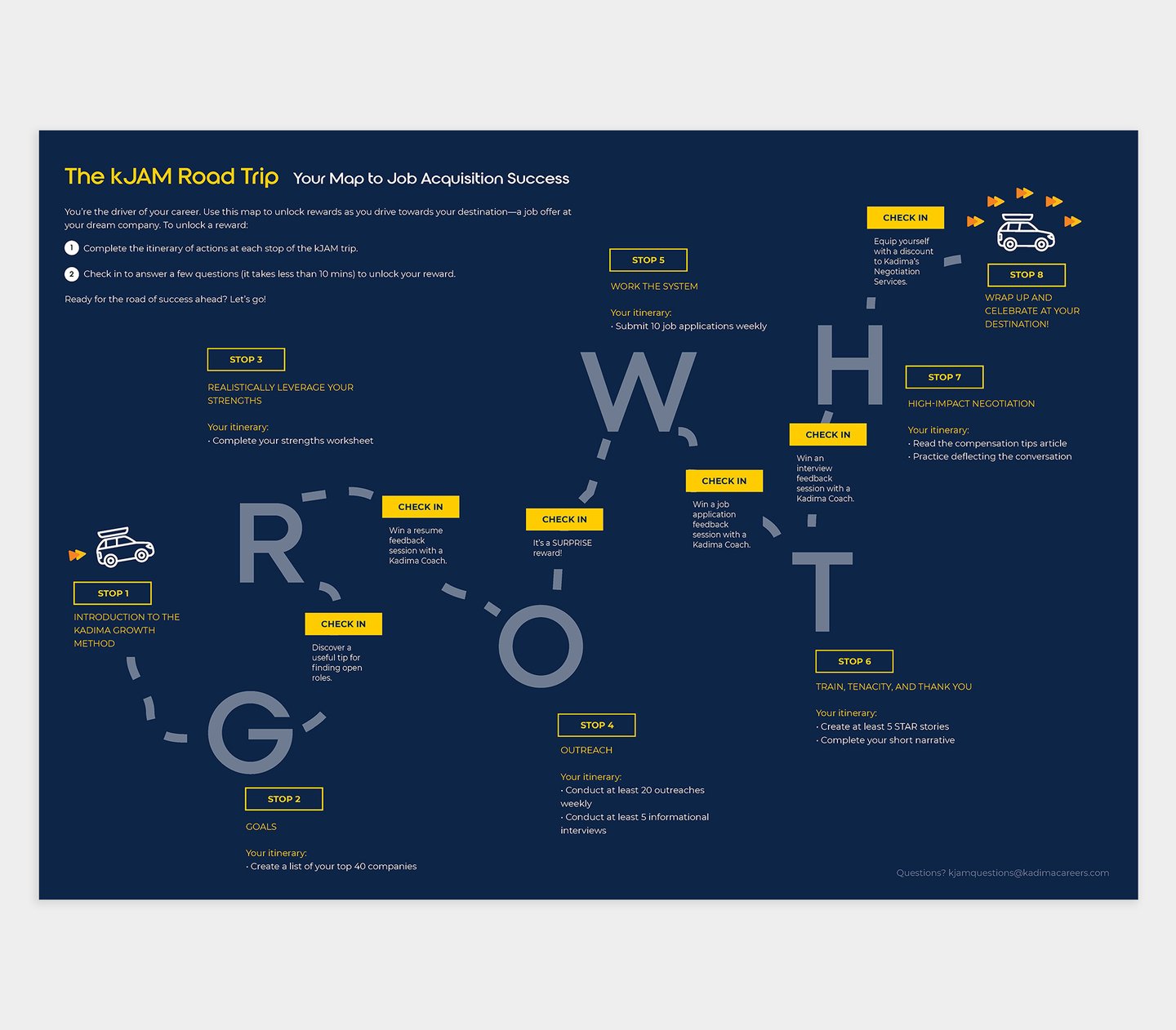I first proposed a music tour theme: the "kJAM music tour," with the participant as the "musician of their soundtrack." However, Alan made a good point that Kadima's brand is all about "steering your career." In the end, we landed on a roadtrip theme: the "kJAM road trip: you're the driver of your career." The experience map outlined the GROWTH framework, with each "stop" (module) listing the key deliverables to complete, followed shortly with a "check-in" (short survey) to share how they're doing and any feedback they have.