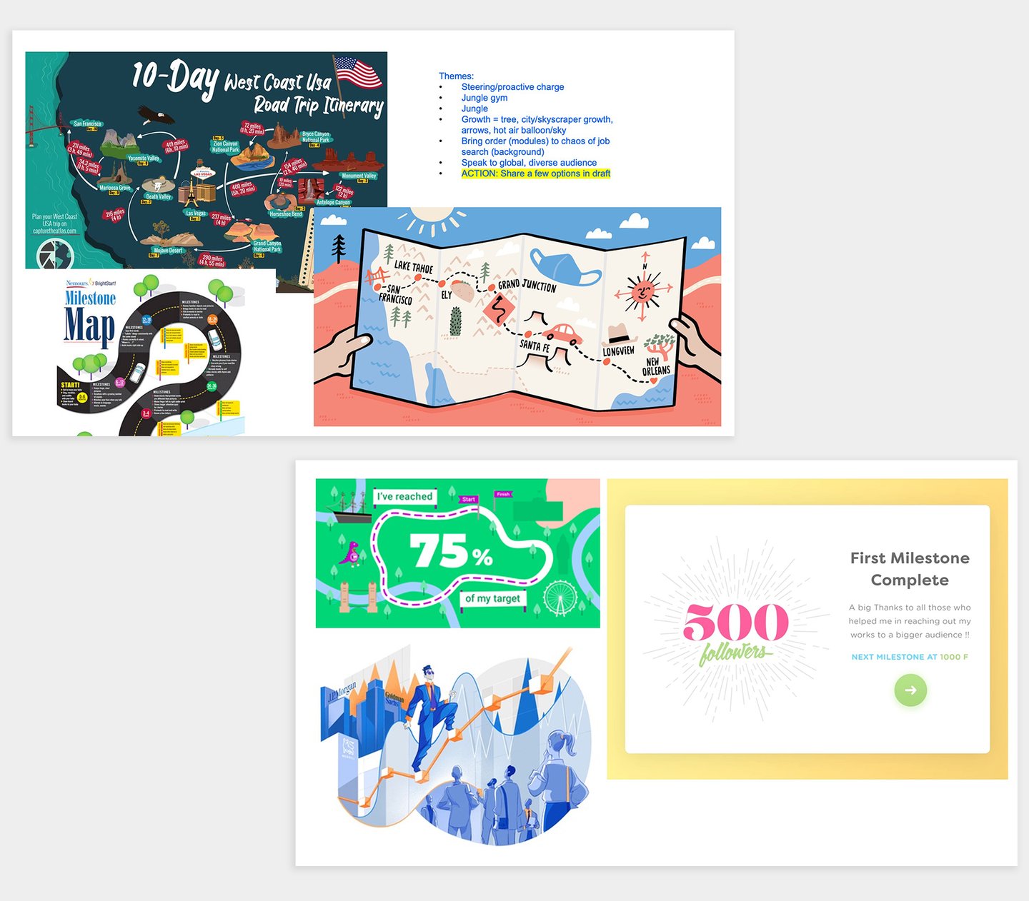 I compiled several ideas into an inspiration board and the Kadima team and I brainstormed additional ones (blue text). We liked the concept of learners "steering" their career and taking action on their job search.
