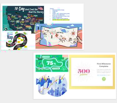 Since the GROWTH framework is the foundation of the kJAM course, I created a background visual of the acronym as the path of the road trip. Each "stop" on the trip clicked to the module in the course with an itinerary of actions they must complete. Each "check in" after a stop took participants to a quick survey with less than 5 questions. A reward is given if the participants completes each stop's itinerary and checks in.