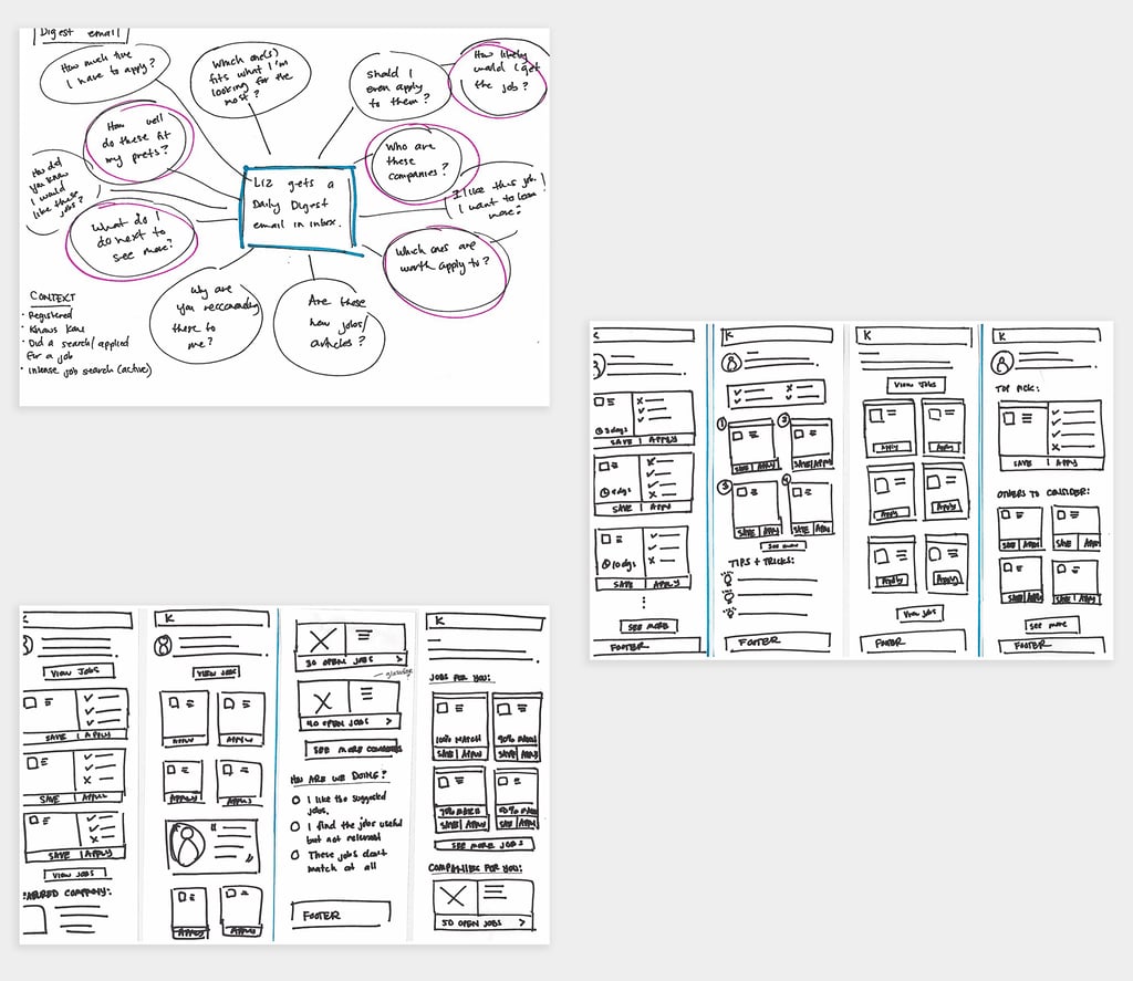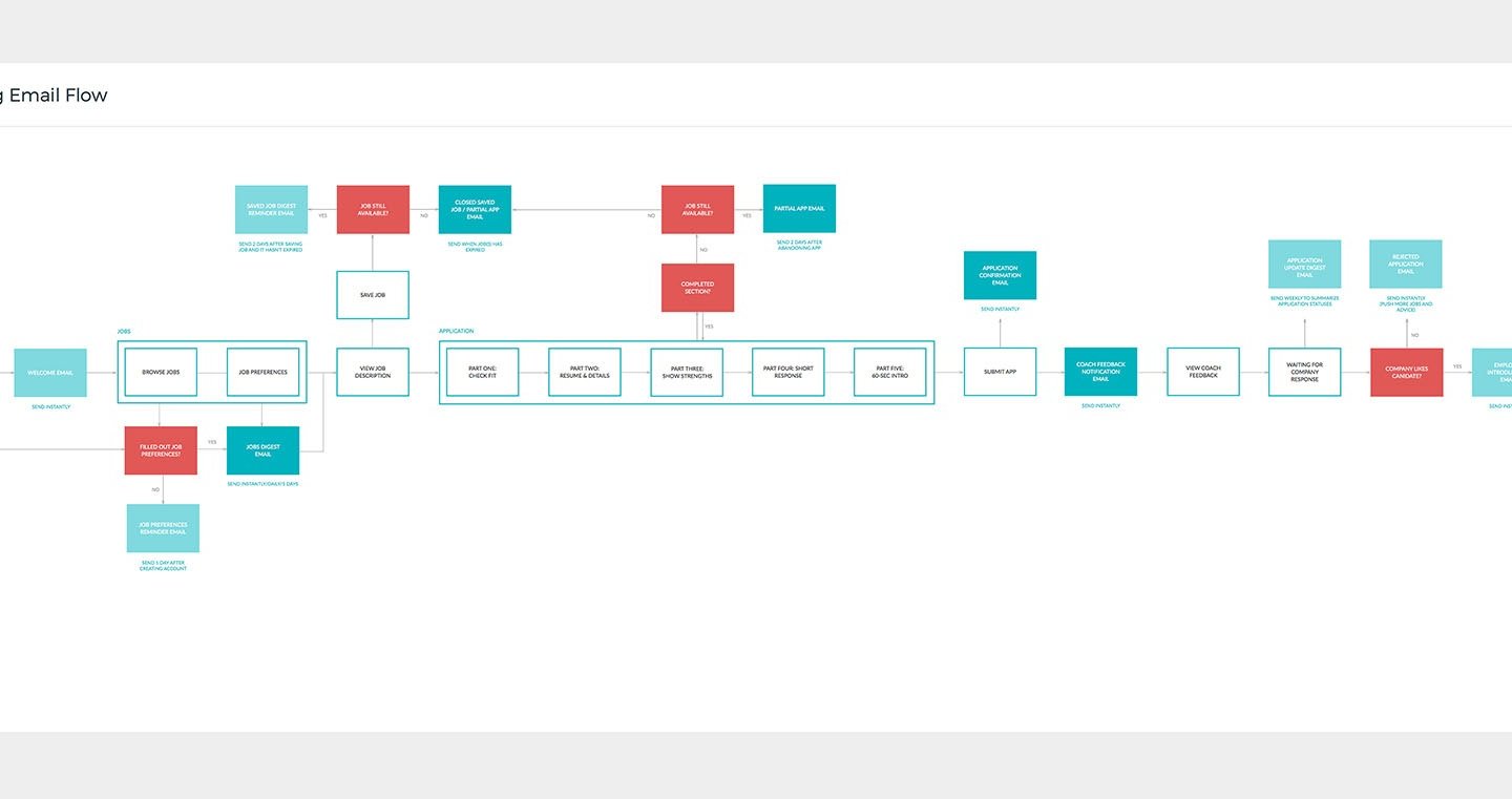 I created an email flow that applied ideas from the design sprint. It mapped out the experience and outlined when and how the user would get an email. The Koru team provided feedback on the email's triggers and provided valuable knowledge of the job platform to ensure the experience was cohesive.