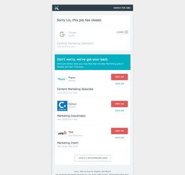 The closed job email notifies users when a job they've saved or started applying for has closed. It shares similar jobs to encourage them to continue their search.
