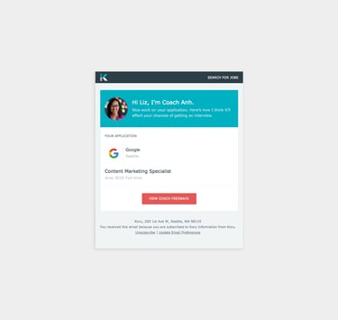 The coach feedback email notifies users of feedback they've received on their application from a Koru coach.