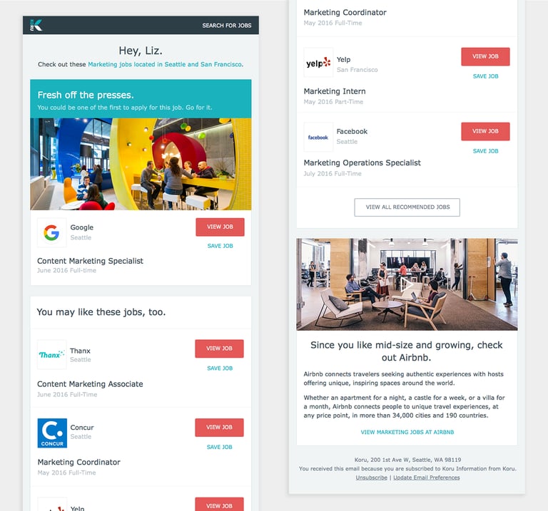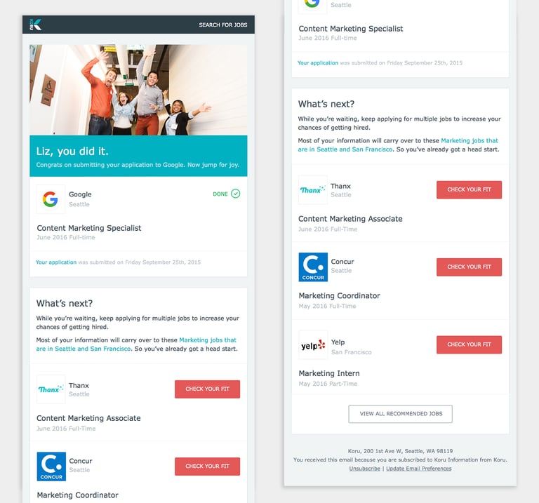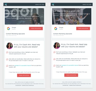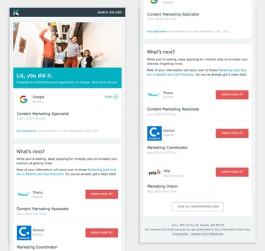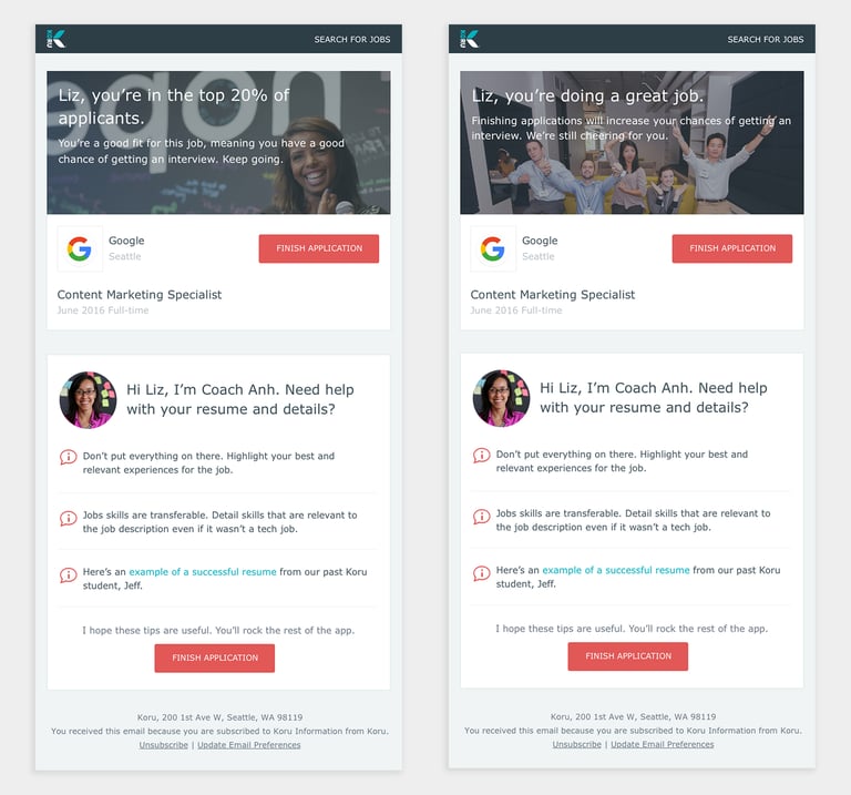 I designed a series of nurturing emails to encourage applicants to complete their job application process on Koru's platform.