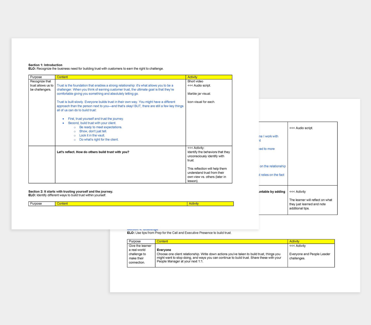 An example of how we gathered content with SMEs, focusing on the script first, and then brainstorming visuals and activities for each lesson. We also used this template to gather feedback from SMEs throughout.