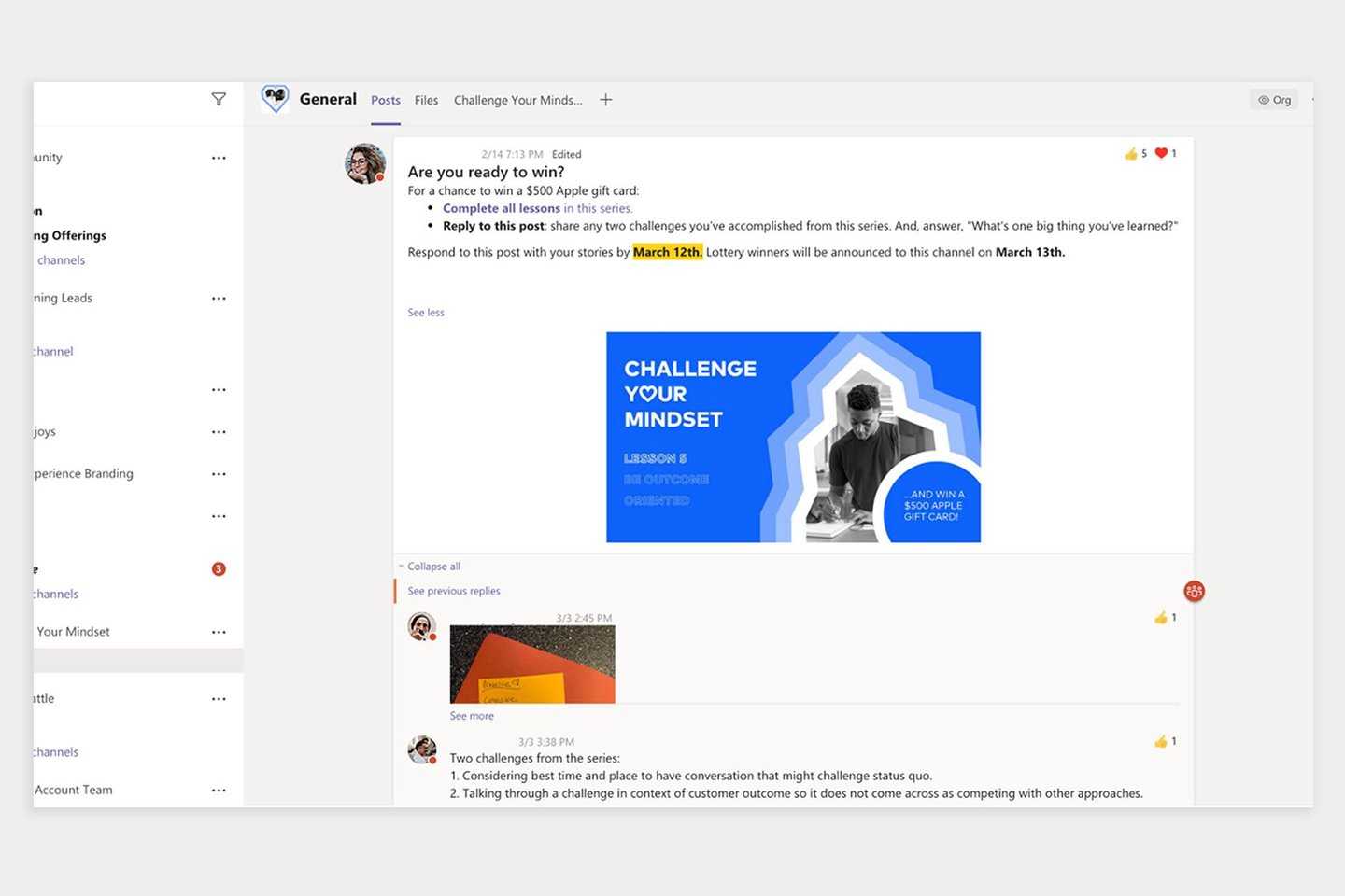 To incentivize our learners, we included a small challenge at the end of each lesson. We built a course community site using Microsoft Teams where people can post their responses to the challenge.