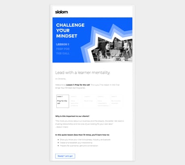 We landed on a micro-learning series focused on five key skills for respectfully challenging our clients to meet their outcomes. Each micro-lesson (10 mins or less) is emailed every two weeks. It focused on a skill and provided a learning “challenge” for consultants to apply back to their job. We pitched this learning approach to Slalom leaders and gained their buy in.