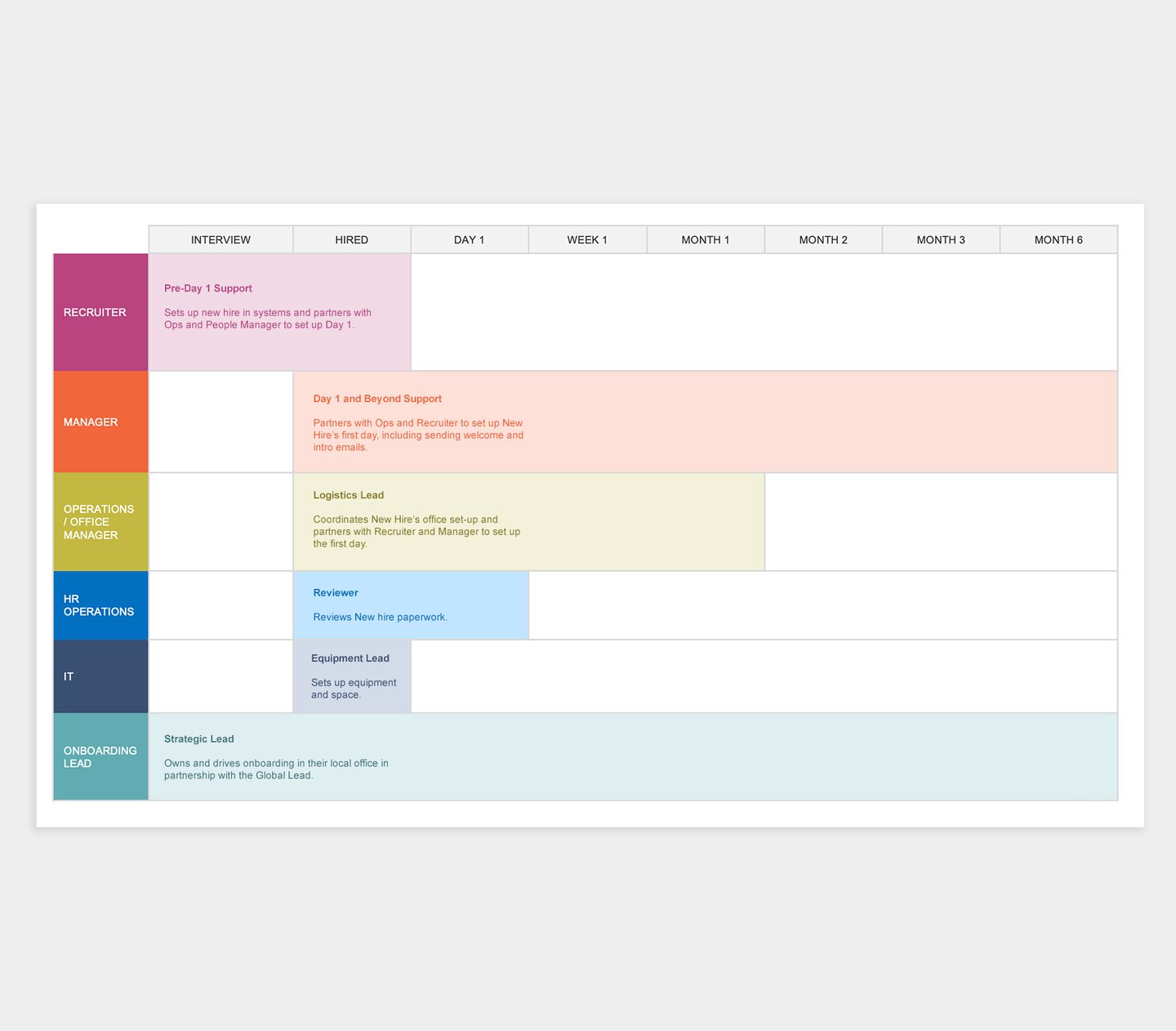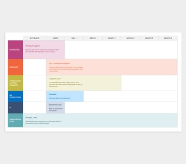 I created the Onboarding Operation Model to provide structure, support, and clear responsibilities so people managers, onboarding leads, operations, and others can easily support the core experience within their offices.
