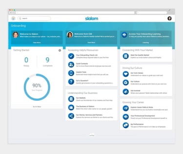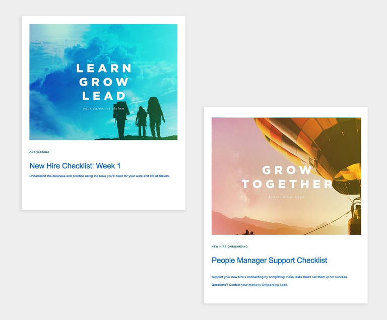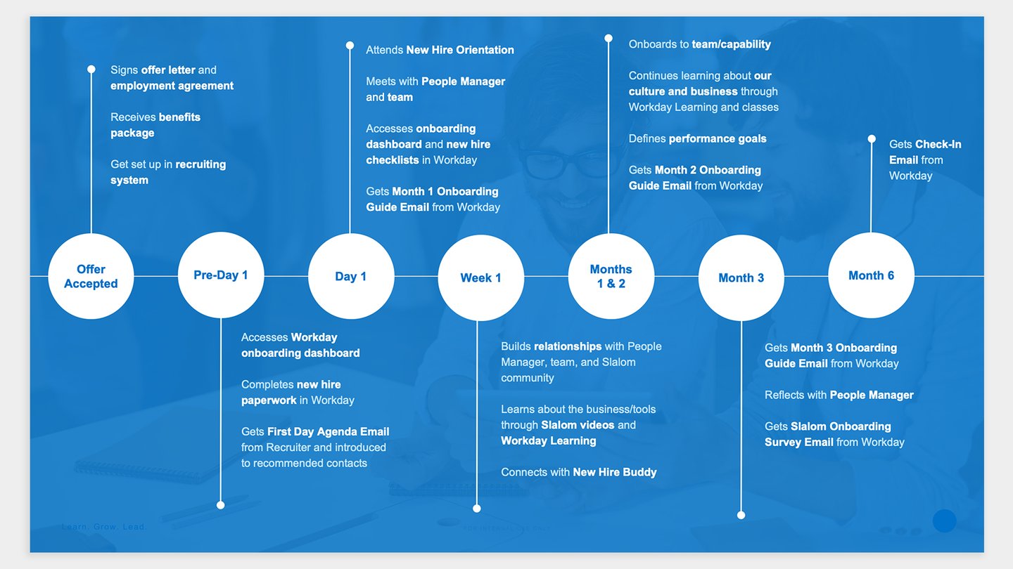 Once they start and up till six months, they can use the dashboard to access timely checklists (day one, week one, month one, two, etc.) to complete key tasks and learning, attend New Hire Orientation, and asynchronous, bite-sized learning resources such as short videos of Slalom's business and culture, guided conversation templates with their manager about goal setting and performance, and more.