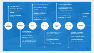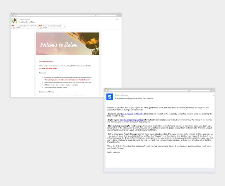 Timely, personalized communications. New hires receive personalized communications throughout their first six months from their local office and automated communications from Workday, which includes onboarding guides with key focuses for that day, week, or month.