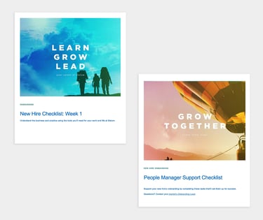 Onboarding checklists for new hires and managers. New hires are provided day one, week one, and month 1-3 checklists with required and optional tasks to set them up for success. Managers are provided a checklist when a new hire joins their team to support their onboarding. Built as interactive PDFs, they can check off tasks and save progress as they go.